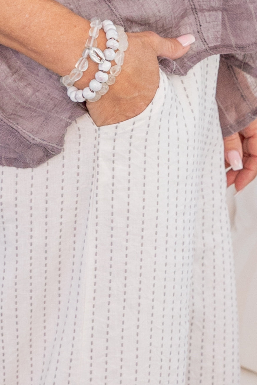 These ivory colored pants have a decorative stitch stripe woven into them, which is a great match to the Sorrento Tee or Amalfi Blouse in Charcoal. If you love the NEW matchy look for Summer, you should snap up the matching Naples Blouse before they are gone forever.
